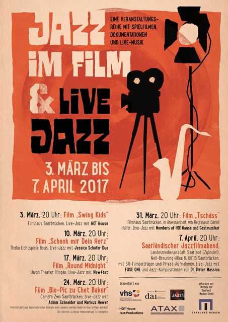 Die Liebhaber von Jazzfilmen und Jazzmusik sollten sich die Termine schon mal notieren. An insgesamt sechs Abenden im März/April 17 präsentieren die Volkshochschule im Regionalverband Saarbrücken, das Deutsch Amerikanische Institut Saarland und der Freundeskreis Jazz e. V. diese Reihe mit Spielfilmen, Dokumentationen und Musik. Finanziell unterstützt wird das Festival durch Saarland Medien GmbH, ATAX Steuerberatung und Wirtschaftsprüfung in Neunkirchen und HOT House Jazz-Productions Riegelsberg.