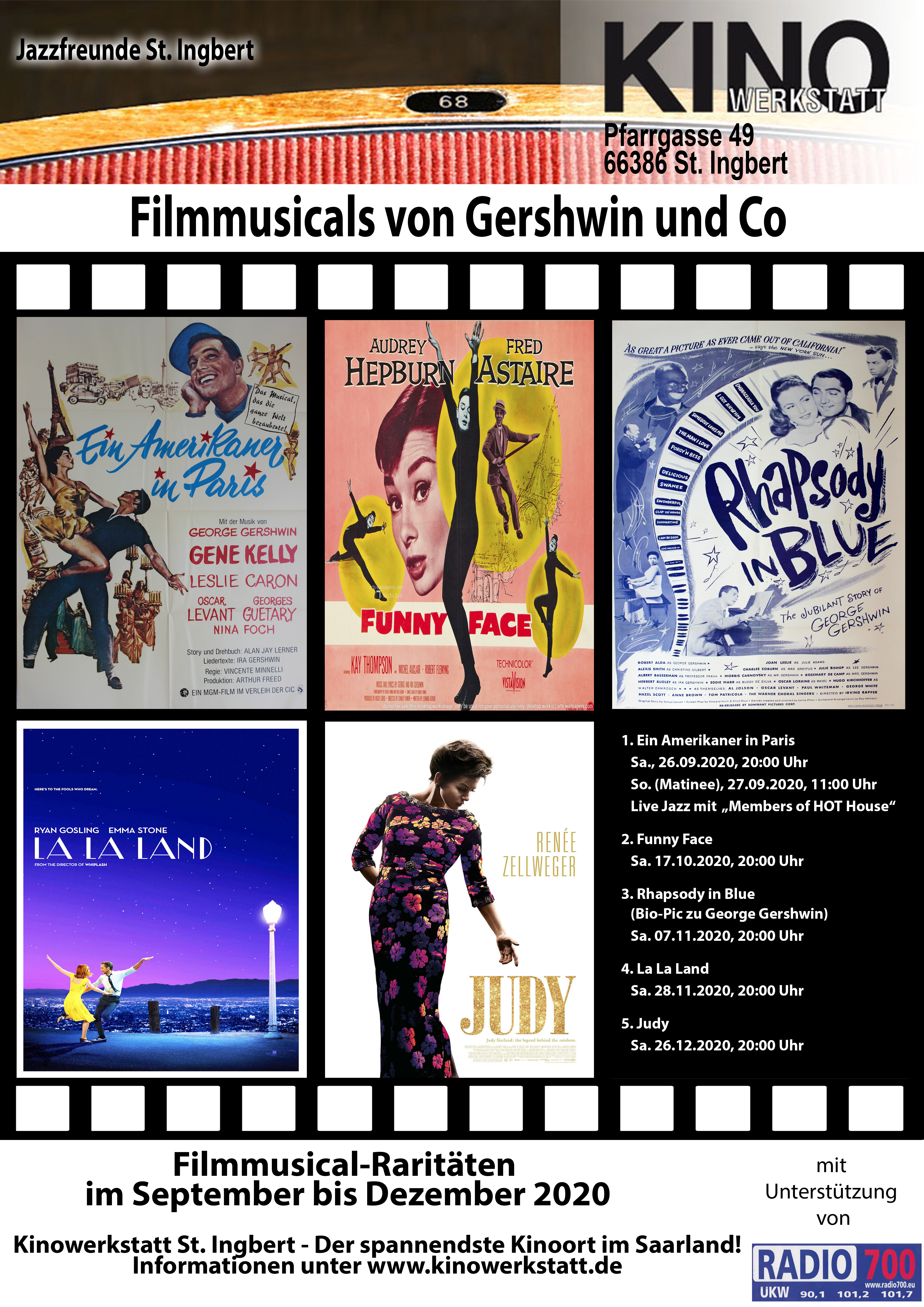 Die Kinowerkstatt St. Ingbert und die Jazzfreunde St. Ingbert präsentieren von September bis Dezember 20 insgesamt fünf Filmmusicals. Drei stammen aus den fünfziger/sechziger Jahren, zwei sind aus der jüngeren Vergangenheit. Sie zeichnen sich durch viele Tanz- und Gesangseinlagen aus. Meist dienten erfolgreiche Musikproduktionen des Broadways als Vorlage. Während sich in Amerika in den 30er Jahren das Broadway-Musical etablierte, entstand parallel auch das Filmmusical.
