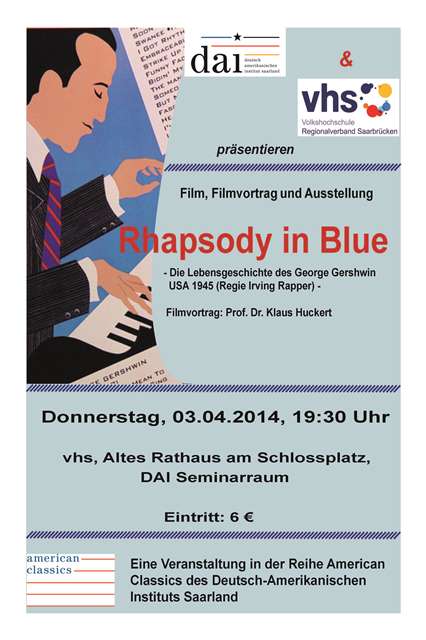 1945 drehte Irving Rapper den Schwarz-Weiß-Film „Rhapsody in Blue“, der die Lebensgeschichte von George Gershwin in idealisierter Form erzählt. Die Hauptrolle in dieser Biografie übernahm der Schauspieler Robert Alda. Der Film enthält ein wunderbares Medley an Gershwin-Melodien. Wir zeigen ihn in einer remasterten DVD-Version mit deutschen Untertiteln. Prof. Dr. Klaus Huckert, der mehrere Multimedia-Projekte zu Gershwin realisiert hat, gibt vor der Vorführung des Films eine Einführung und zeigt markante Punkte im Leben von George Gershwin auf. Aus seiner umfangreichen Privatsammlung über Gershwin werden Exponate wie Filmplakate, Fotografien, Lobbyfotos, Bücher, DVDs, Münzen und Briefmarken in einer kleinen Ausstellung präsentiert. Ein informativer, unterhaltsamer, spannender und musikalisch interessanter Abend erwartet das Publikum. Die Veranstaltung findet in Kooperation der VHS Saarbrücken mit dem Deutsch-Amerikanischen Institut Saarland im Rahmen von dessen Konzertreihe American Classics statt.