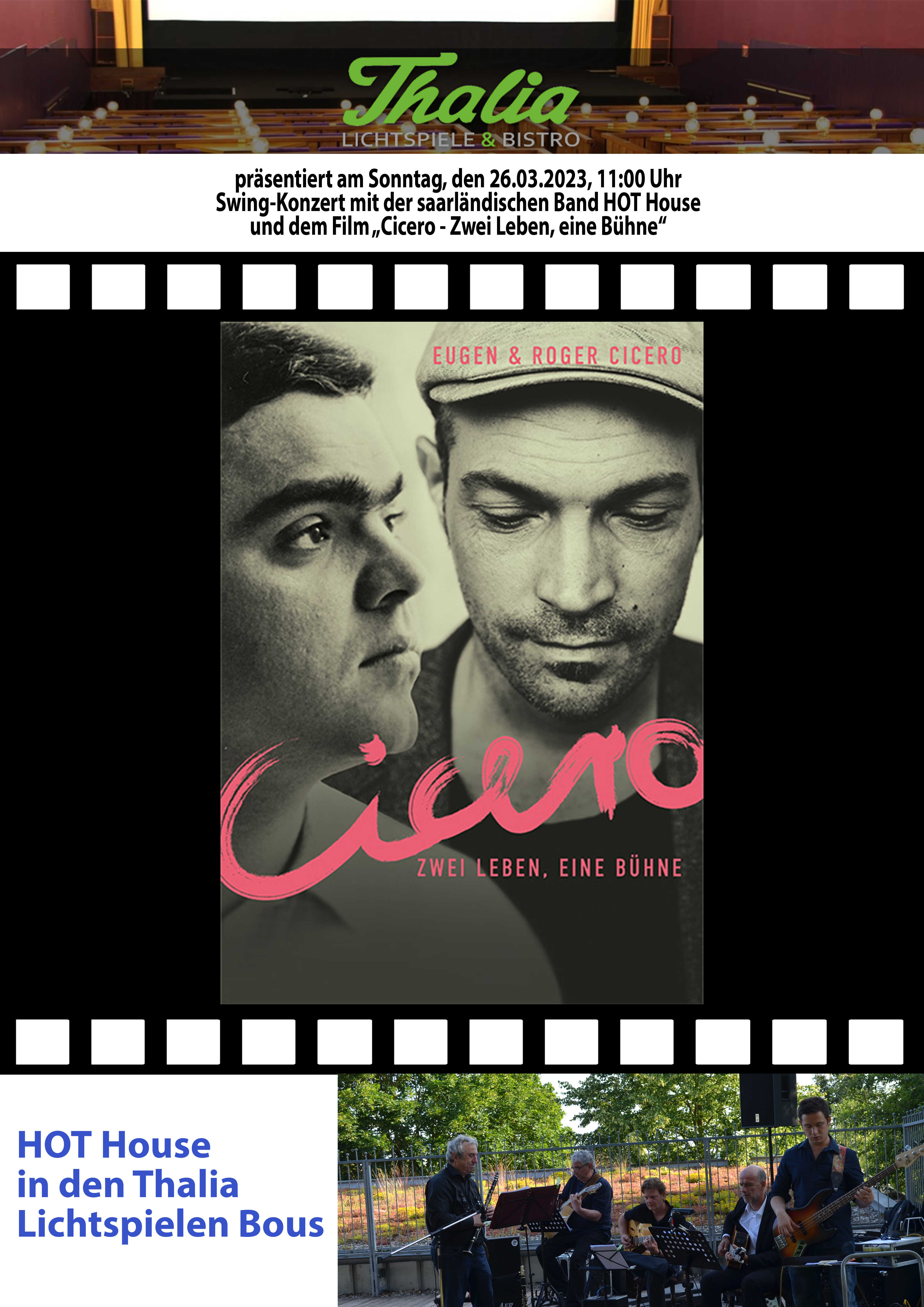 Die Thalia Lichtspiele Bous präsentieren am Sonntag, den 26.3.2023 um 11.00 Uhr in einer Swing-/Film-Veranstaltung die Dokumentation zu Eugen/Roger Cicero „Cicero – Zwei Leben, eine Bühne“. Für die passende Musik an diesem Sonntagmorgen sorgt im Vorprogramm die saarländische Swing- Formation „HOT House“.